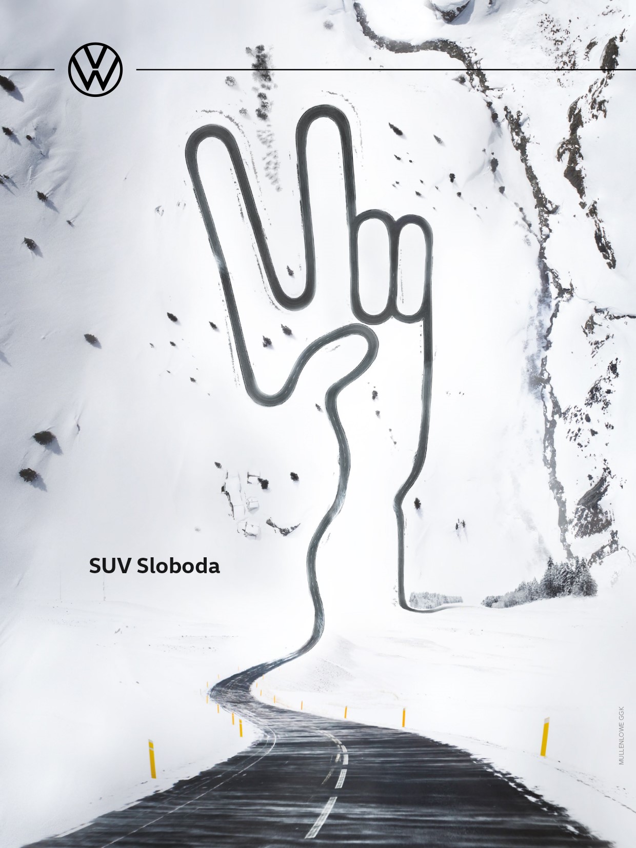 V našom printovom vizuále komunikujeme segment SUV Volkswagen vozidiel bez toho, aby sme zobrazovali samotné vozidlá. To nám dáva priestor na väčšiu abstraktnosť a predstavivosť. Spojili sme symbol slobody a víťazstva do kompozície, vďaka ktorej priestor získal nové pravidlá. Využívame tiež “ohýbanie” priestoru, ktorý nás vťahuje na do deja a otvára sa pred nami v plnej šírke printu. Z horizontu prechádzame do vtáčej perspektívy, kedy vnímame zasnežené strechy domov, stromy z nadhľadu, rieku a skaly, a nakoniec sa opäť strácame za horizontom v lese.